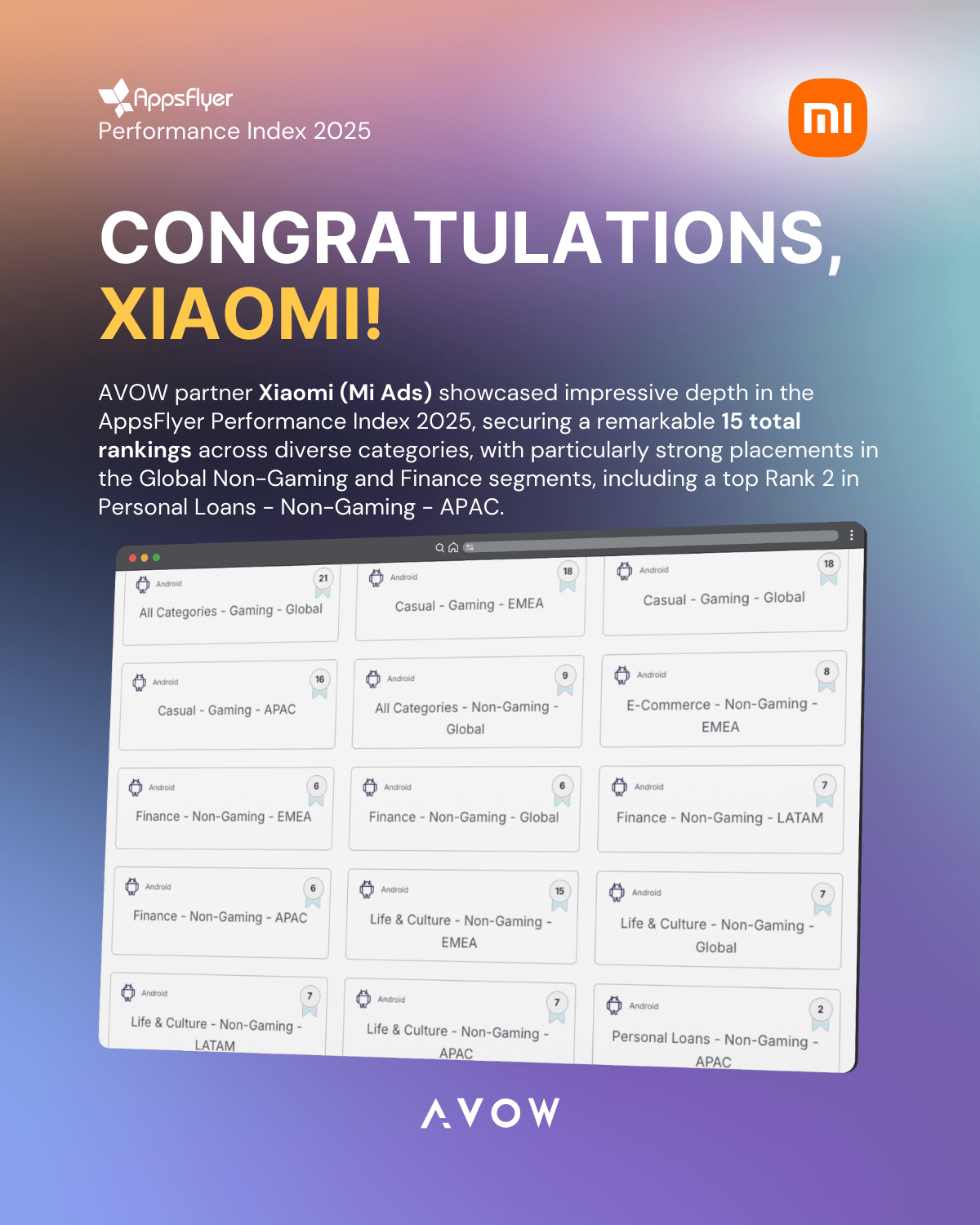 Xiaomi (Mi Ads) showcased impressive depth in the AppsFlyer Performance Index 2025, securing a remarkable 15 total rankings across diverse categories, with particularly strong placements in the Global Non-Gaming and Finance segments.